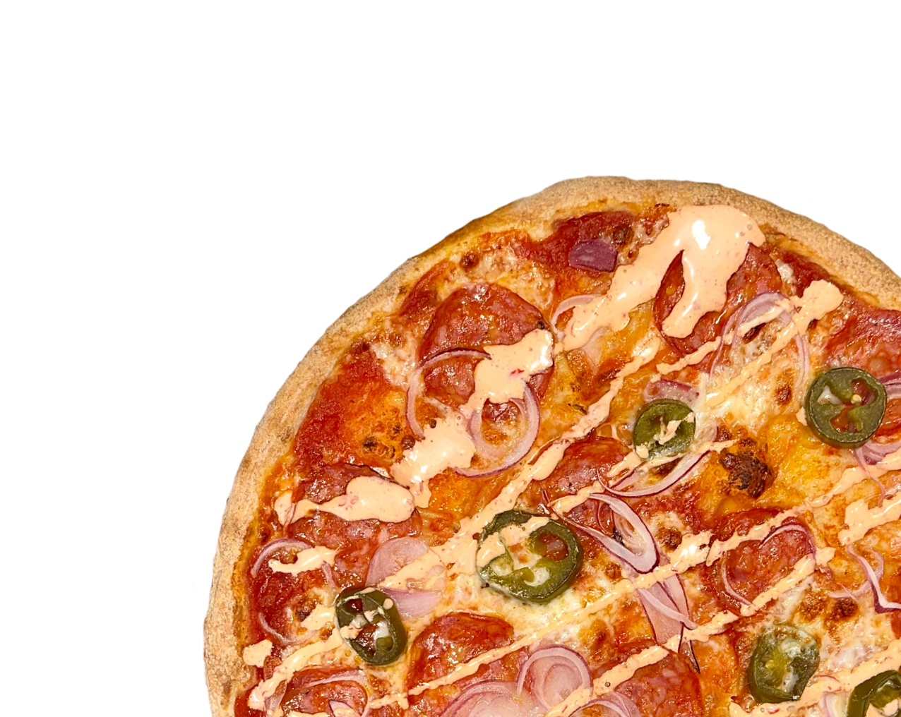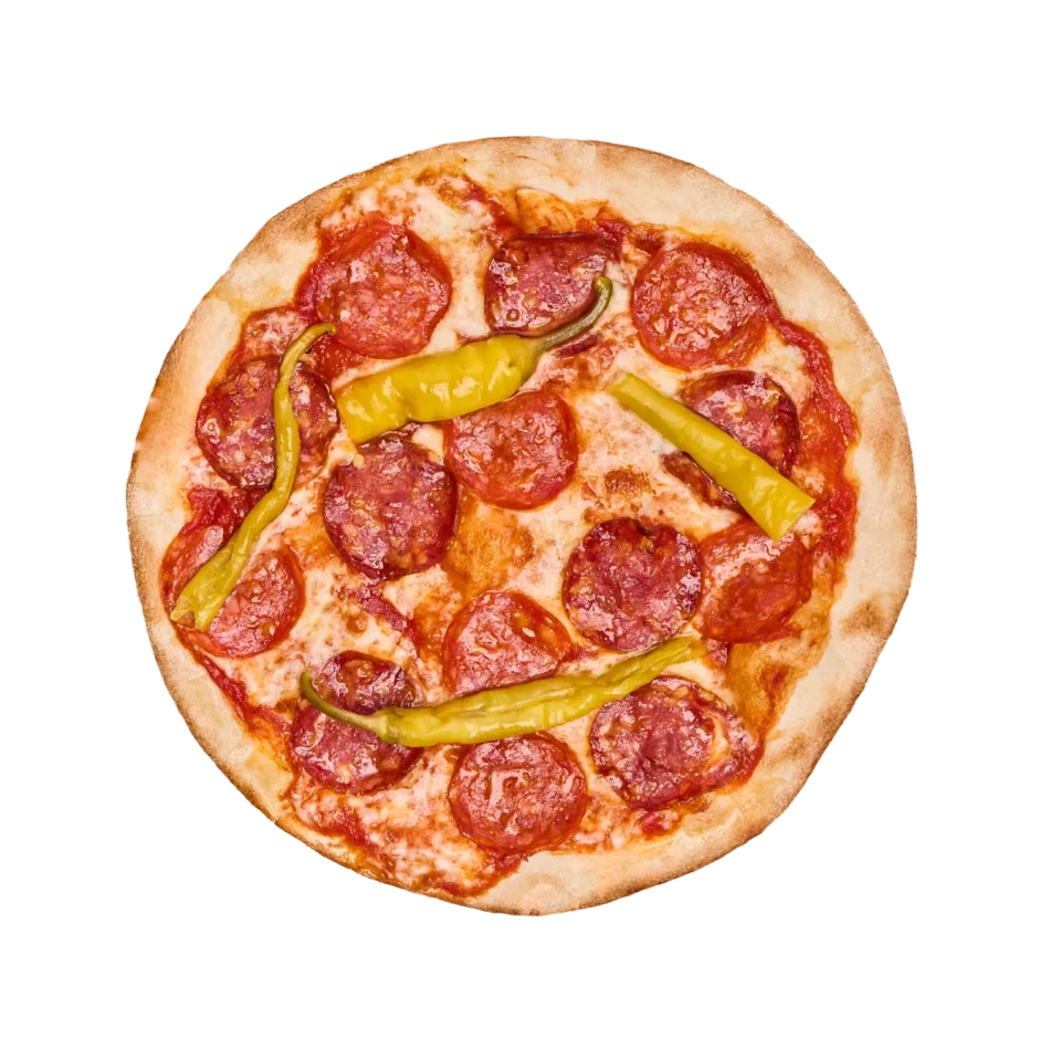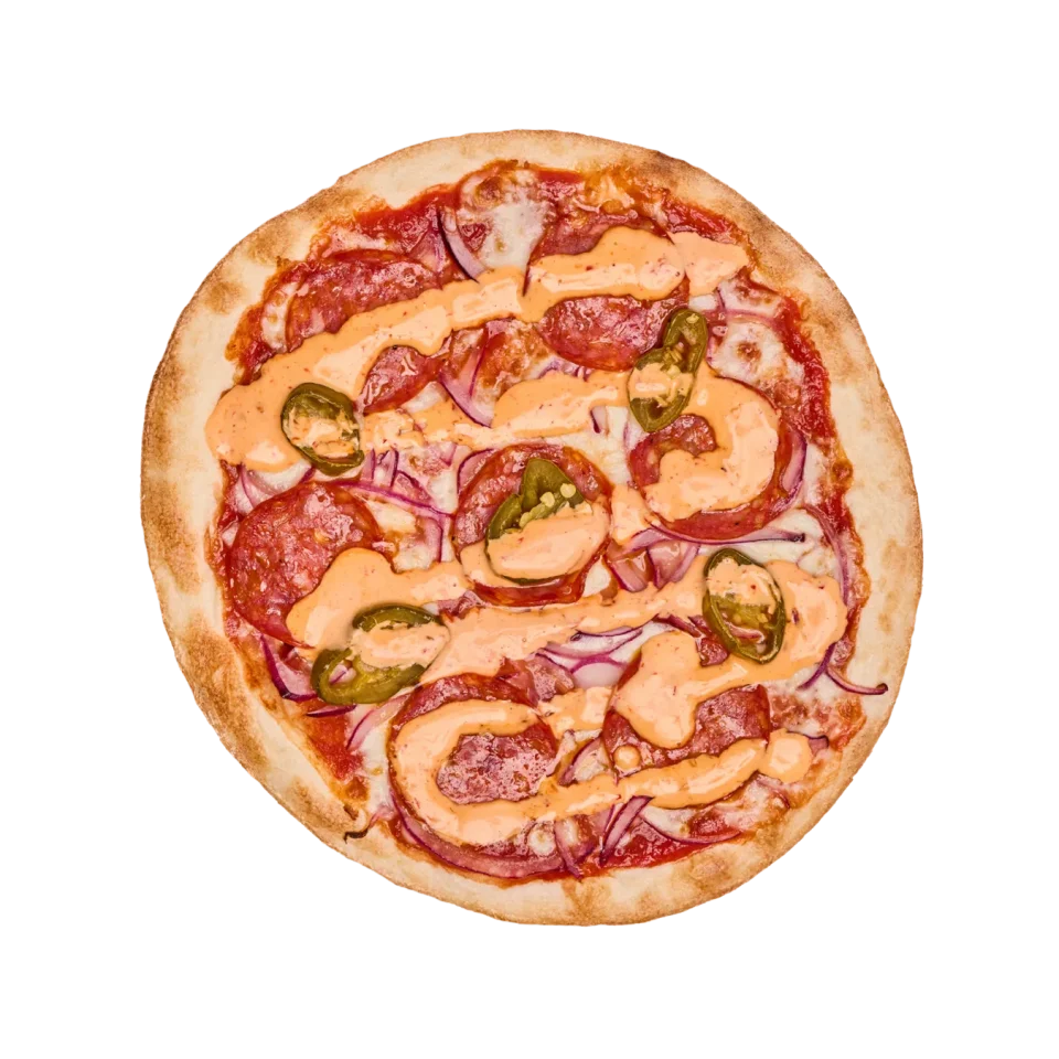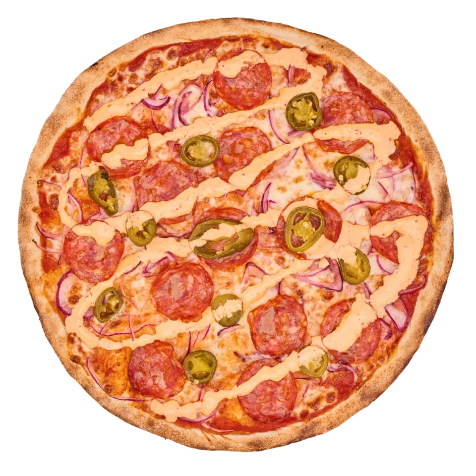 Szupercsípős szalámi, jalapeno, erős pistás szósz, lilahagyma, mozzarella, paradicsomszósz