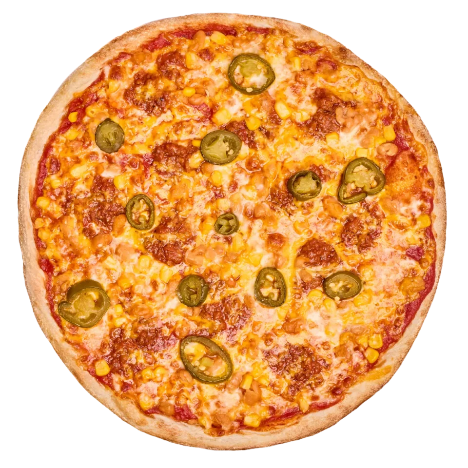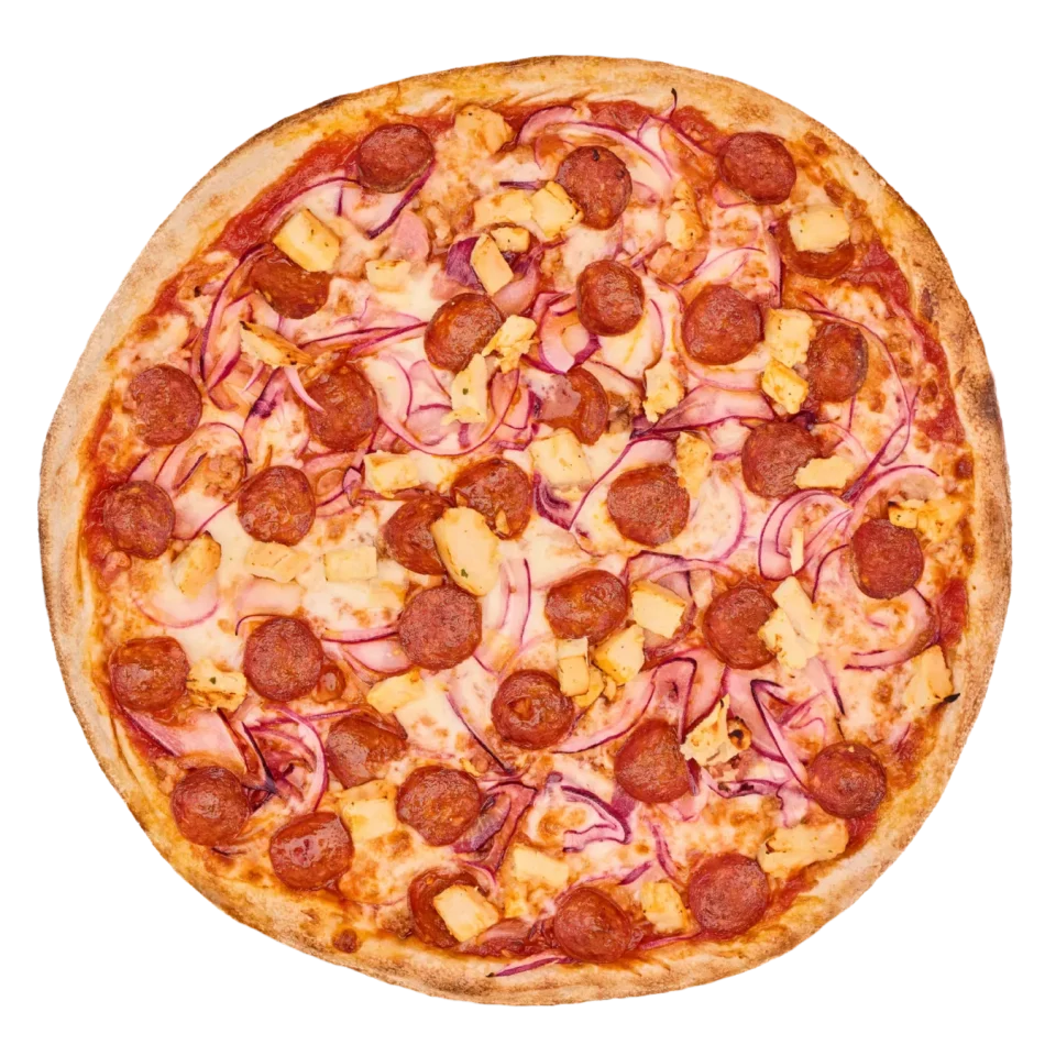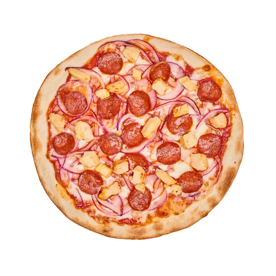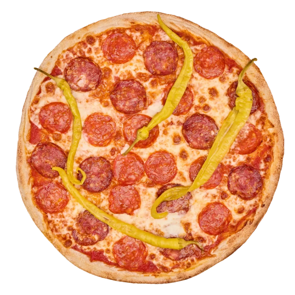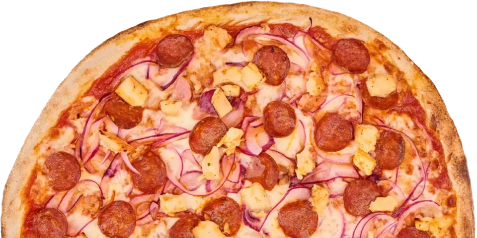 Szupercsípős szalámi, jalapeno, erős pistás szósz, lilahagyma, mozzarella, paradicsomszósz