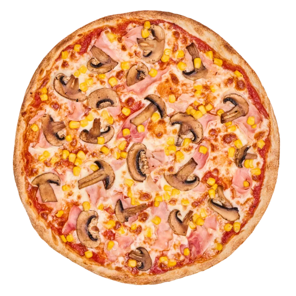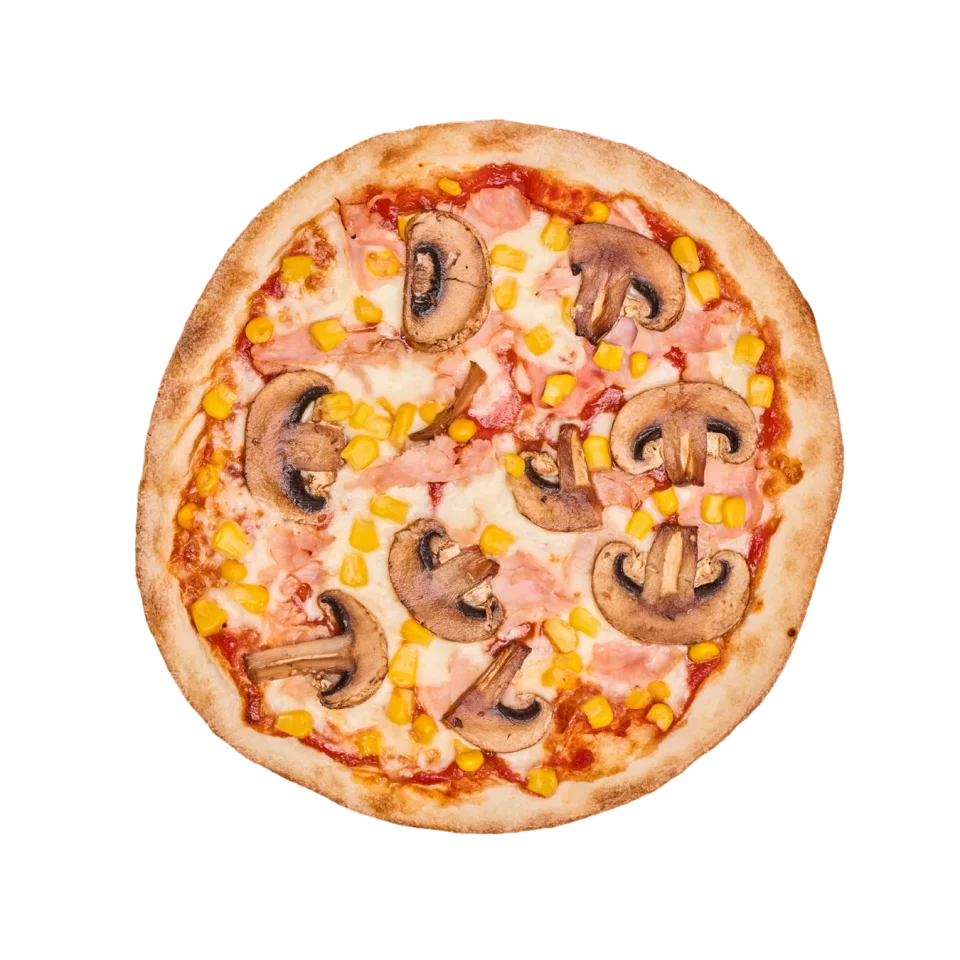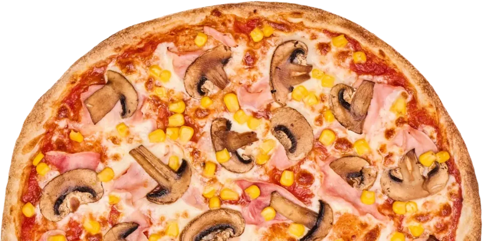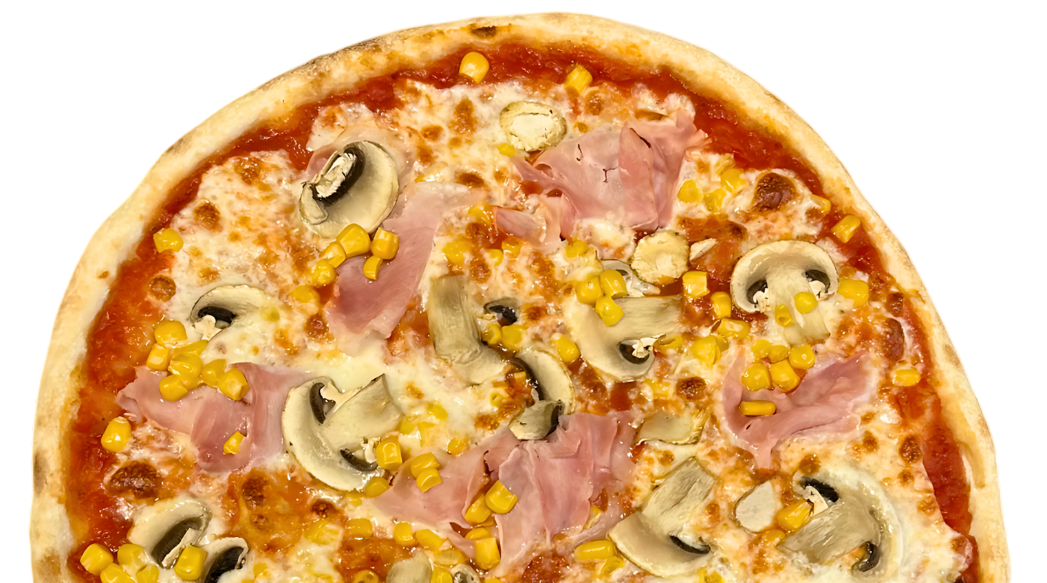 Sonka, gomba, kukorica, mozzarella, paradicsomszósz