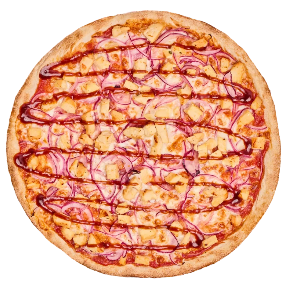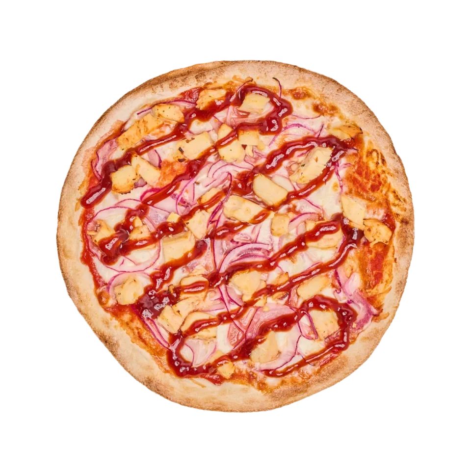 Csirkemell, BBQ szósz, lilahagyma, oregánó, mozzarella, paradicsomszósz
