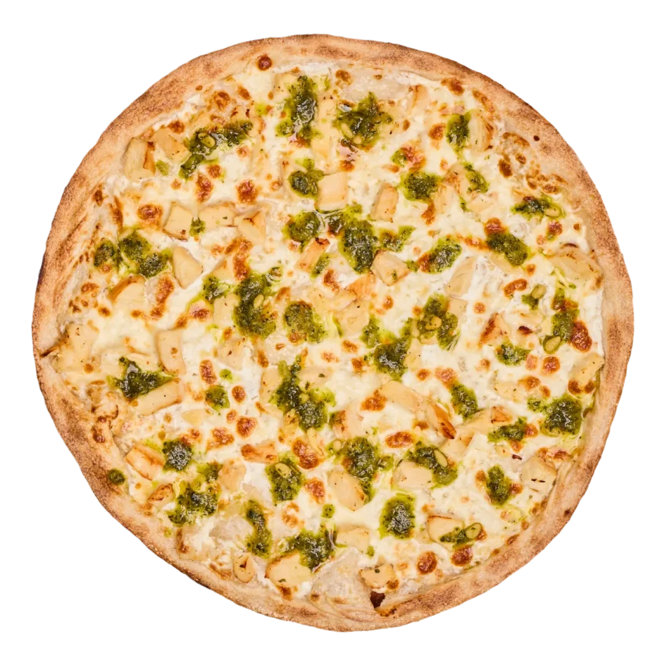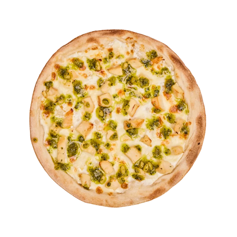Tejszínes alap, csirkemell, zöld pesztó, mozzarella