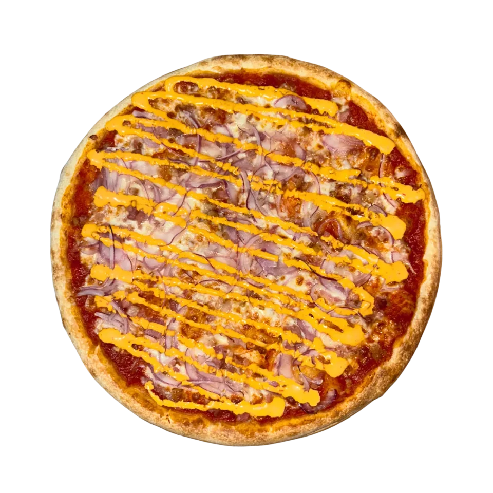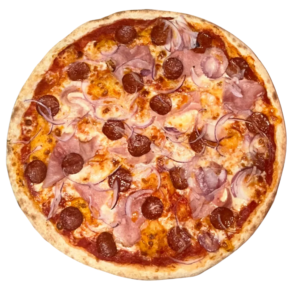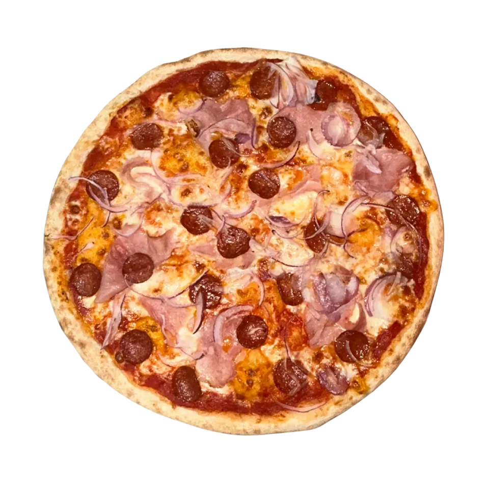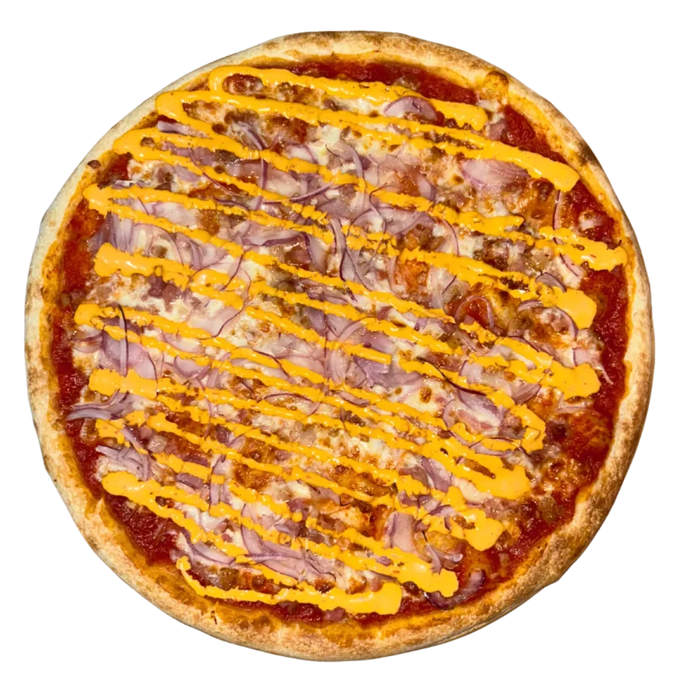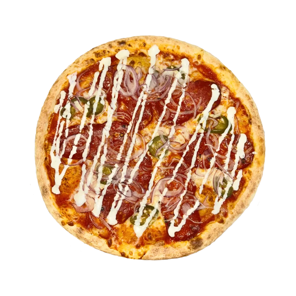 Szupercsípős szalámi, jalapeno, erős pistás szósz, lilahagyma, mozzarella, paradicsomszósz