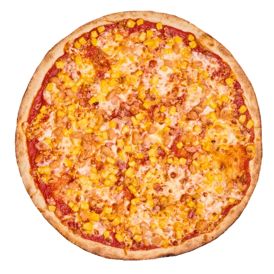 Chilis bab, cheddar sajt, kukorica, bacon, mozzarella, paradicsomszósz