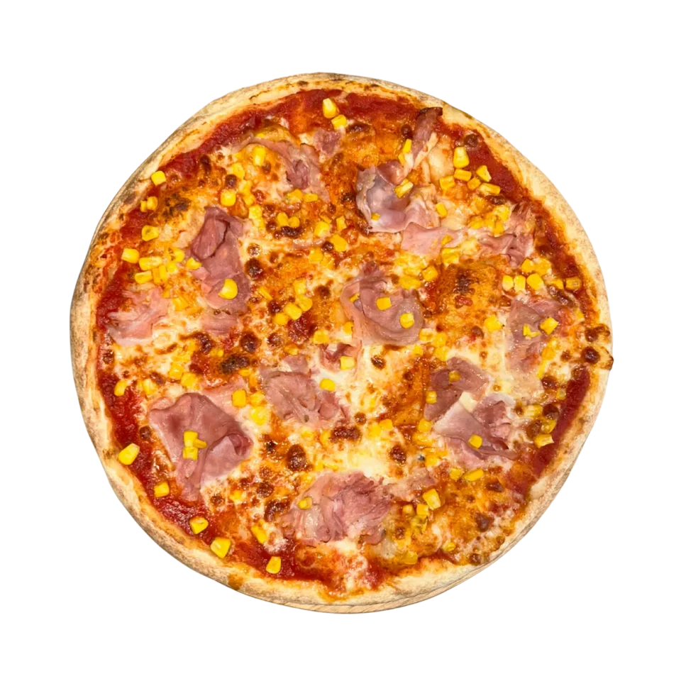 Sonka, gomba, kukorica, mozzarella, paradicsomszósz