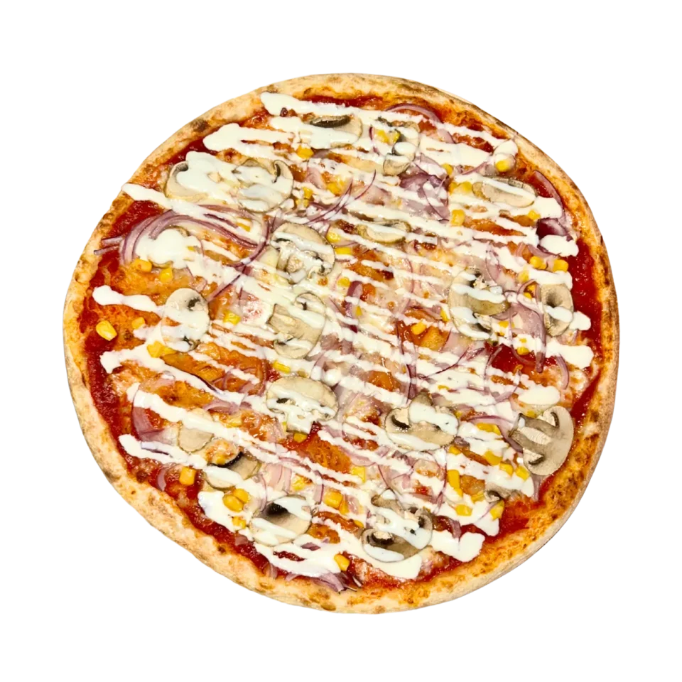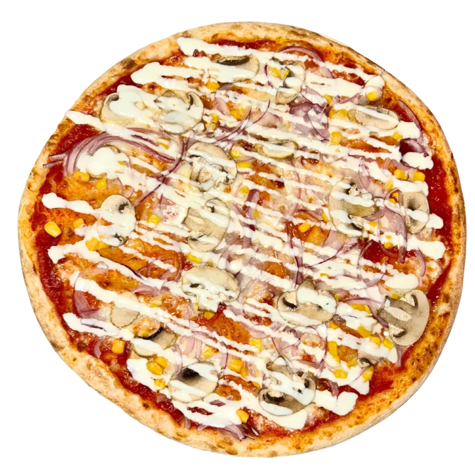 gomba, kukorica, lilahagyma, fokhagymás majonéz, mozzarella, paradicsomszósz